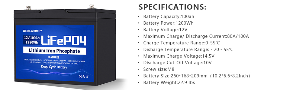 2pcs 100Ah lithium batteries, large enough to store 2.4KWh of power. New type lithium battery which has higher charge/discharge efficiency and more than 3000 times deep cycles. Over 10 years of lifespan, much longer than lead acid batteries. With built-in BMS(battery management system), preventing the lithium battery from overcharge, overdischarge, overheat and short circuit.