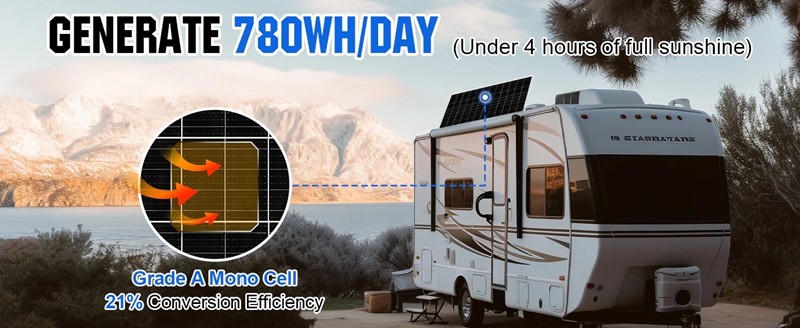 ·Ideal Output: 1000Wh per day (under 5 hours of sunlight); can fully charge a 50Ah Battery from 50% in 1. 5 hours (depending on the availability of sunlight).