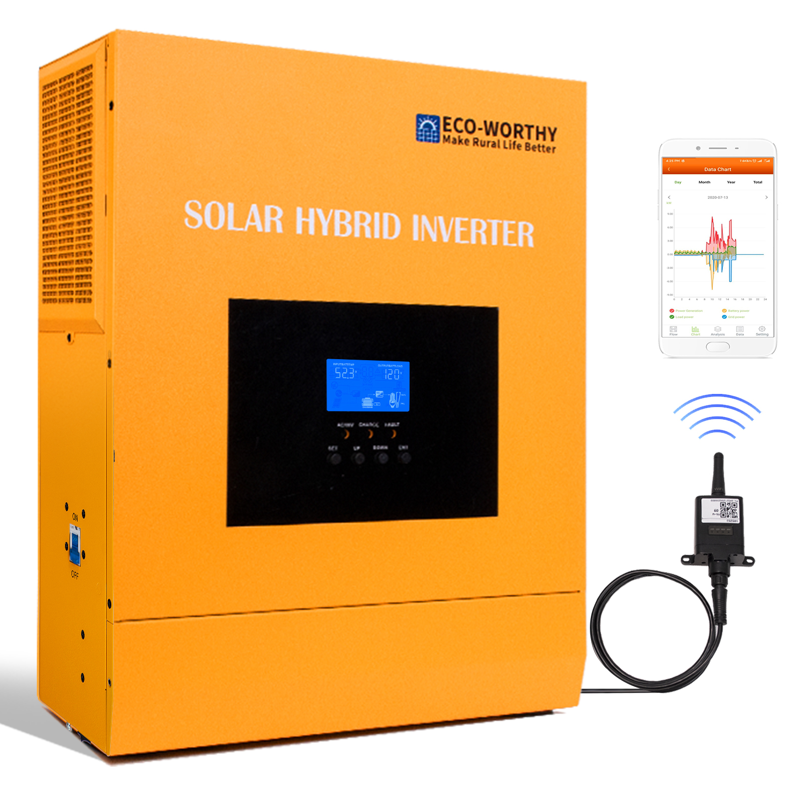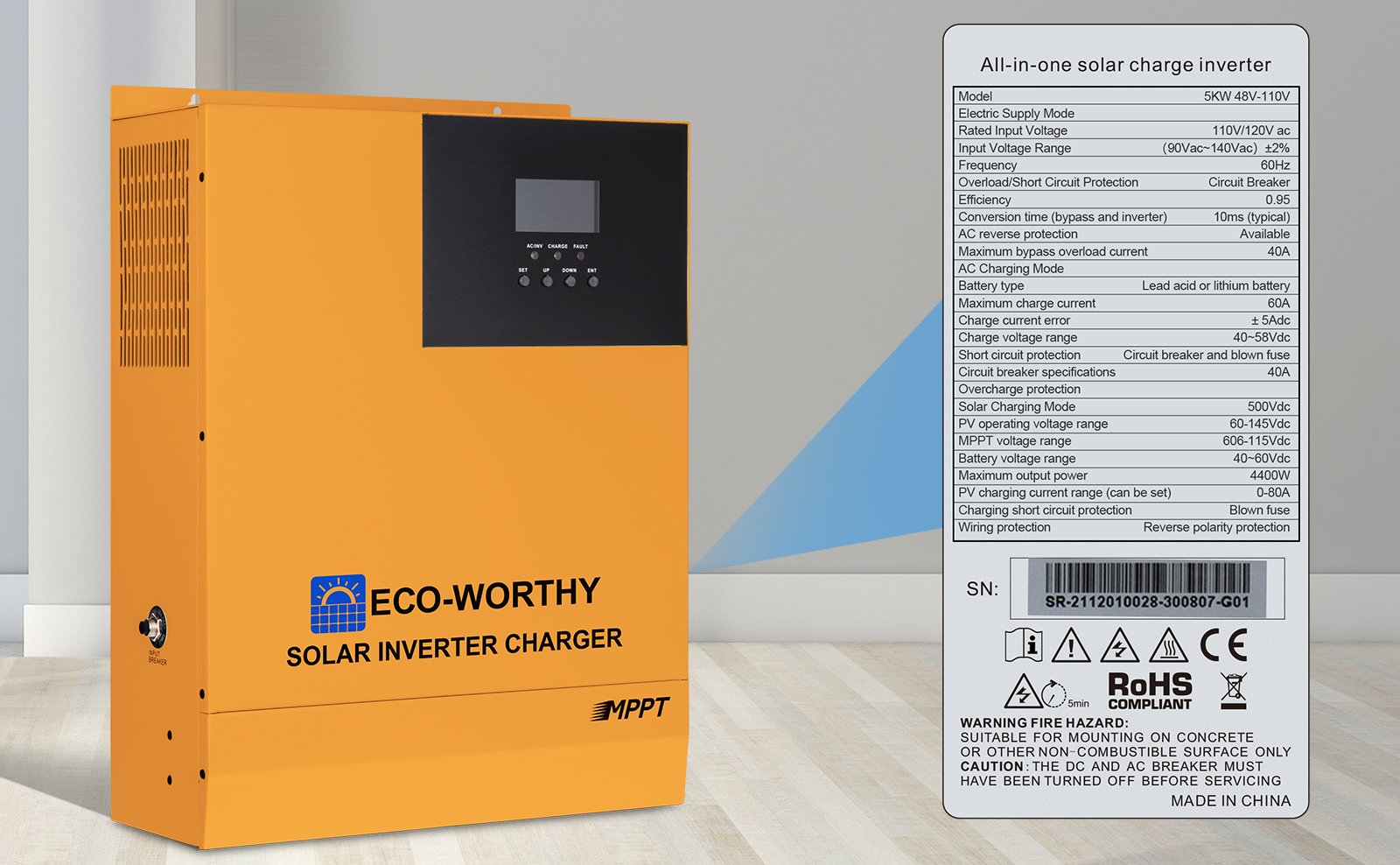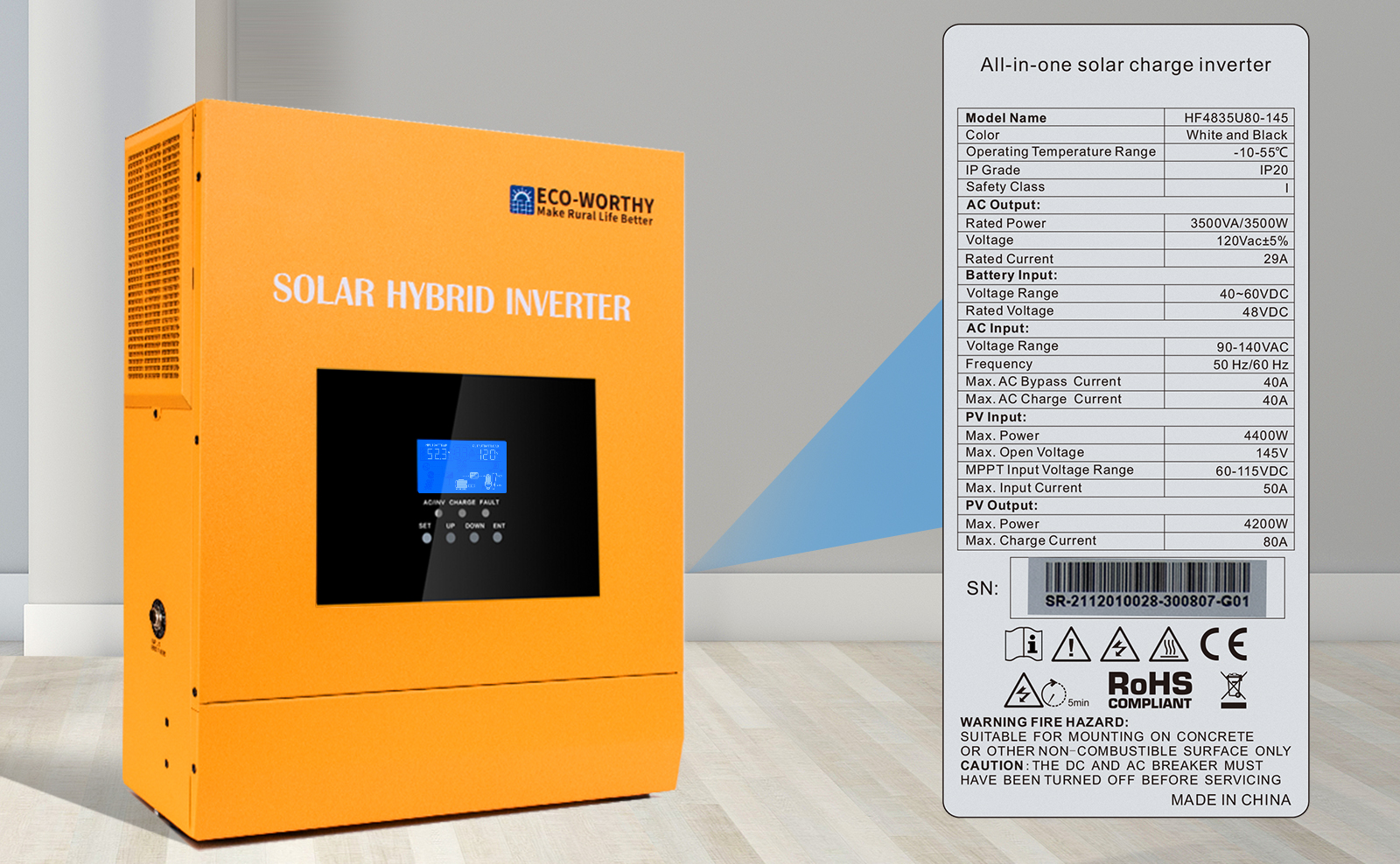 ECO-WORTHY All-in-one Inverter  is a new hybrid solar energy storage inverter control all-in-one machine integrating solar energy storage and commercial power charging energy storage and AC sine wave output. It adopts DSP control and has advanced response algorithms and high reliability through advanced control algorithms. And high industrialization standards. There are only four charging modes: solar power, city power priority, solar power priority, city power and solar power. Three output modes: Solar power priority mode, Grid power priority mode, Inverter priority mode, are available to meet different application needs.
